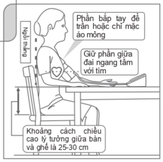 Ngồi thẳng, bàn chân tiếp xúc phẳng với sàn nhà và đài quần vòng quanh bắp tay. Đạt cảnh tay nằm phẳng trên mặt bản với lòng bàn tay hướng lên. Giữ phần giữa của đại nằm ngang với tầm tim. Ngồi yên 5 phút trước khi đo.
