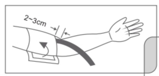 Quấn đai vòng quanh bắp tay sao cho phích cắm ống hơi hướng xuống phản cẳng tay. Giữa mép dưới đai ở vị trí trên khớp khuỷu tay tầm 2-3cm và giữ ông tiếp hơi được chèn vào đai nằm ở mặt trong cánh tay.