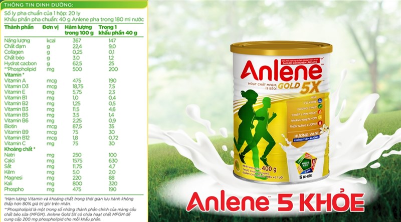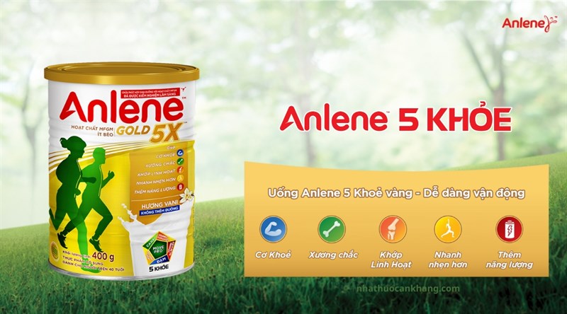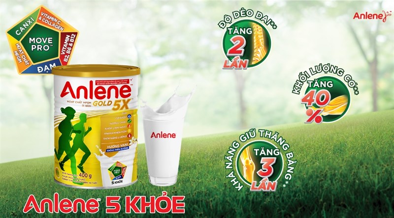 Công dụng : Sữa bột Anlene Gold 5X với các thành phần Đạm, Canxi, Vitamin C và collagen, hoạt chất MFGM cùng các loại vitamin B,... giúp bổ sung dinh dưỡng và mang lại các kết quả như: - Cơ khỏe: Đạm có vai trò thiết yếu với việc duy trì mật độ cơ. Cơ khỏe mạnh giúp hỗ trợ sự vận động thêm nhanh nhẹn và linh hoạt. - Xương chắc: Canxi rất quan trọng trong việc duy trì mật độ xương. Hệ xương chắc khỏe là nền tảng vững chắc nâng đỡ cho các cơ quan và hoạt động của cơ thể. - Khớp linh hoạt: Vitamin C hỗ trợ sự hình thành collagen - thành phần quan trọng giúp sụn khớp khỏe mạnh, từ đó hỗ trợ vận động linh hoạt . - Nhanh nhẹn hơn: Sản phẩm chứa phức hợp dinh dưỡng với hoạt chất MFGM, các nguyên tố vi lượng và hàm lượng đạm cao được chứng minh giúp vận động nhanh nhẹn hơn. - Thêm năng lượng: Các loại Vitamin B hỗ trợ quá trình chuyển hóa năng lượng của cơ thể. Thêm nguồn năng lượng giúp tăng cường sức sống tươi trẻ trong sinh hoạt hằng ngày.