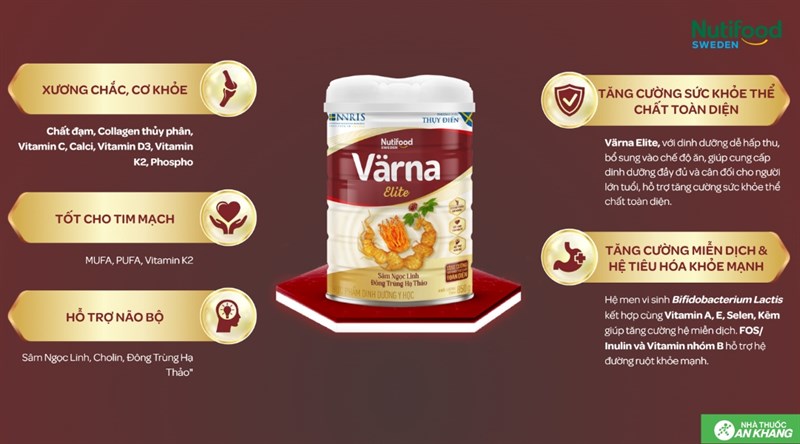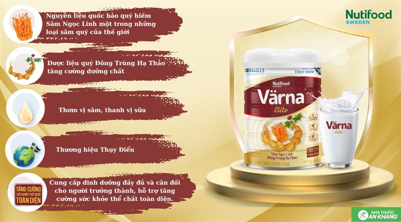Công dụng : Värna Elite là sản phẩm dinh dưỡng dễ hấp thu, giúp cung cấp nguồn dinh dưỡng đầy đủ và cân đối cho người lớn tuổi, hỗ trợ tăng cường sức khỏe thể chất toàn diện bao gồm: - Xương chắc, cơ khỏe: Các chất đạm, collagen thủy phân, vitamin C, Calci, vitamin D3, Vitamin K2, Phospho kết hợp giúp hệ cơ, xương chắc khỏe, ngăn ngừa loãng xương. - Tốt cho tim mạch: sự kết hợp của các thành phần MUFA, PUFA, vitamin K2 giúp giảm lượng cholesterol xấu có trong máu, ổn định huyết áp, giảm sự vôi hóa động mạch, bảo vệ tim mạch. - Hỗ trợ não bộ: Sâm Ngọc Linh và Đông trùng hạ thảo có trong sữa giúp hỗ trợ ngủ ngon và an thần cho một số bệnh nhân mất ngủ thường xuyên, tốt cho não bộ. - Tăng cường sức khỏe hệ miễn dịch và hệ tiêu hóa: Với hệ men vi sinh Bifidobacterium Lactis kết hợp cùng vitamin A, vitamin E, vitamin C, Kẽm, Selen giúp tăng cường hệ miễn dịch. Các thành phần chất xơ (FOS/Inulin) và vitamin nhóm B giúp hỗ trợ hệ đường ruột khỏe mạnh, giúp tiêu hóa và hấp thu tốt.
