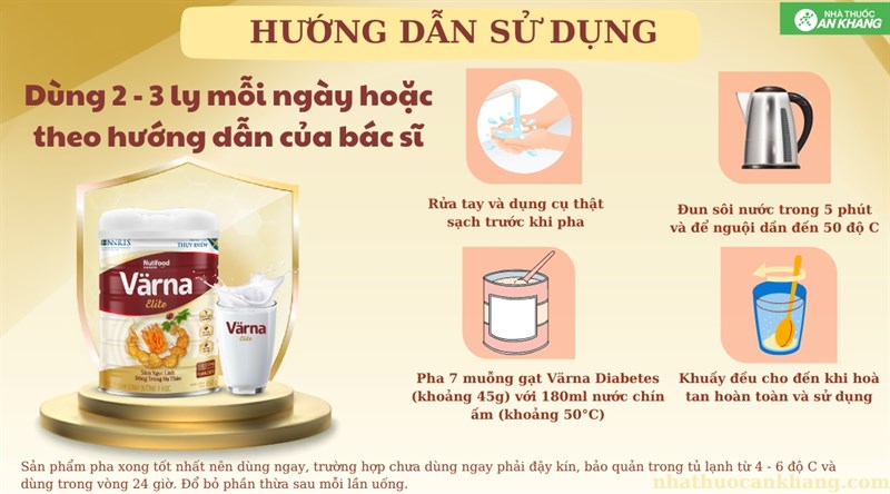Hướng dẫn sử dụng : Rửa tay và dụng cụ thật sạch trước khi pha. Đun sôi nước trong 5 phút và để nguội dần đến 50 độ C. Pha 10 muỗng gạt Varna Elite (khoảng 54g) với 180ml nước chín ấm (khoảng 50 độ C). Khuấy đều cho đến khi hoà tan hoàn toàn và sử dụng. Dùng 2 - 3 ly mỗi ngày hoặc theo hướng dẫn của bác sĩ.